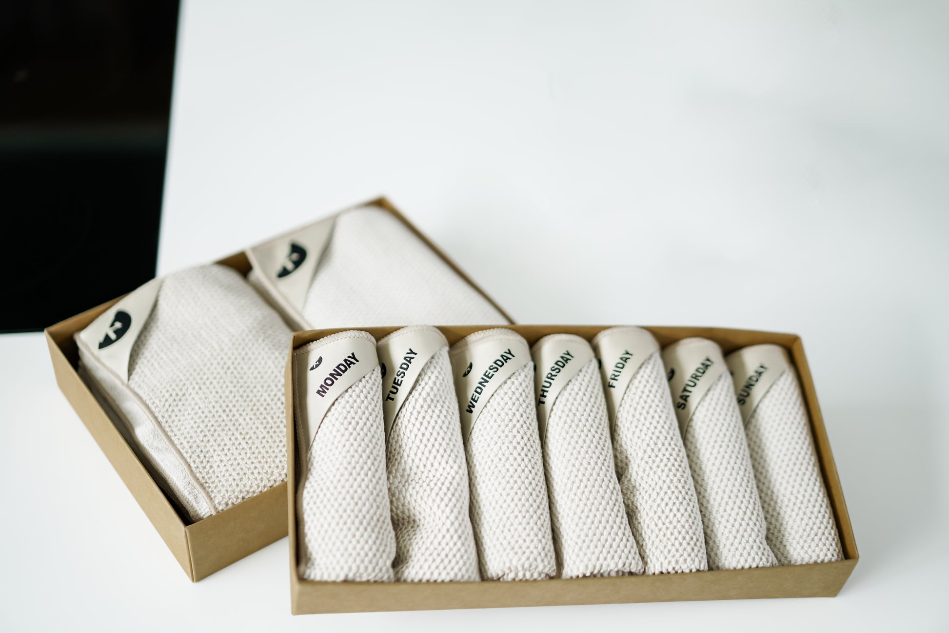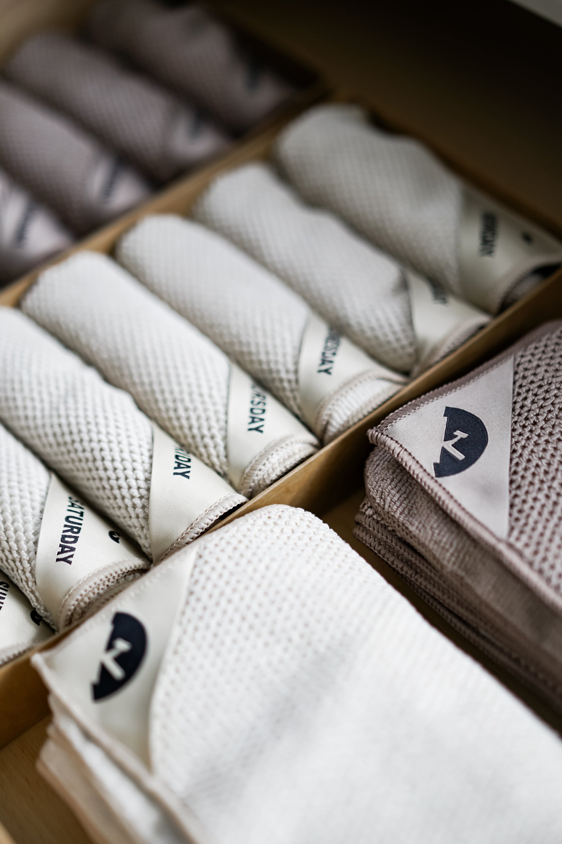Almond | Klud Wafelmotief SET – 2 keukendoeken + 7dagen-vaatdoekjes